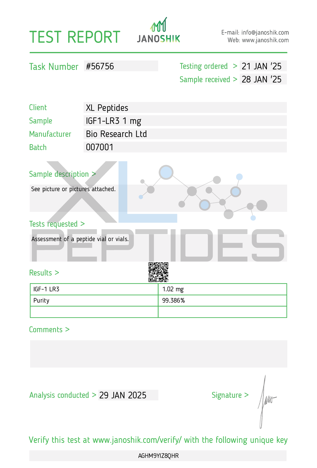 In laboratory and preclinical research settings, IGF-1 LR3 has been extensively studied for its role in cellular growth signalling, protein synthesis pathways, and tissue regeneration mechanisms. Due to its potent interaction with the IGF-1 receptor (IGF-1R), it is commonly explored in studies related to muscle cell proliferation, metabolic regulation, and growth-factor signalling cascades.